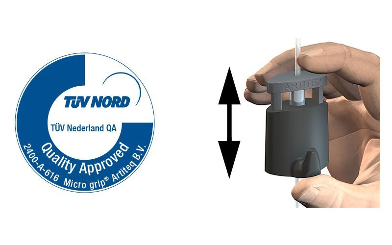 Ett SET med en diskret tunn grå stålvajer som är endast 1 mm tillsammans med Bildkrok Micro Grip 1 mm. Kan placeras var som helst i skenspåret. Vajern är 1 mm/150 cm lång och får inte klippas av. Detta är den tunnaste vajern på marknaden för tavelhängning på galleriskenor med spår från Artiteq.