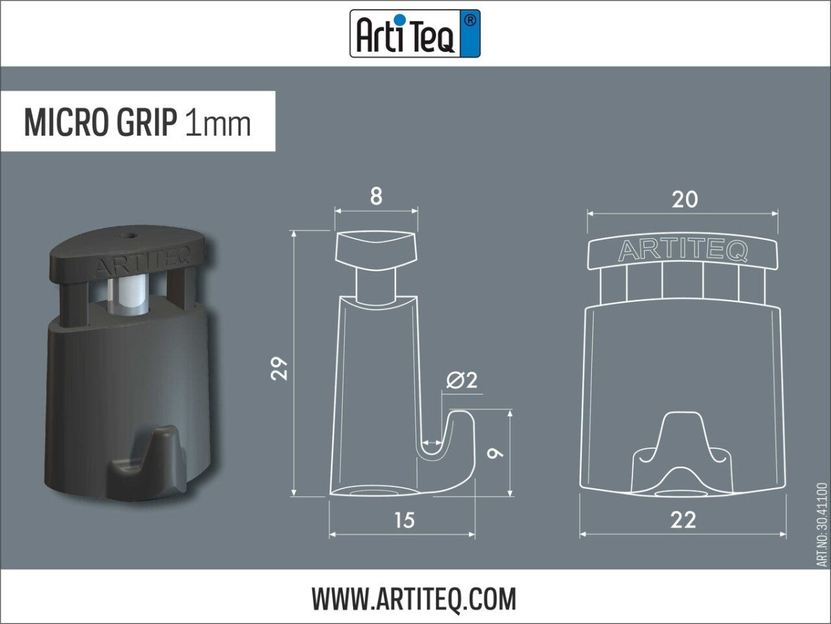 Ett SET med en tunn 1 mm Perlonlina Twister samt Micro Grip krok 1 mm. Framtaget för små och lätta tavlor. Artiteq är först i världen med denna lina för tavelhängning på galleriskena med spår. Transparant, tunn och nästan osynlig med en diameter på endast 1 mm.