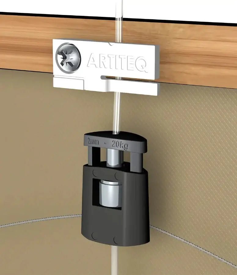 Används för upphängning av tavlor tätare mot väggen. När Du använder galleriskenor i metall eller trä kan överdelen av tavlan, speciellt för små och lätta tavlor hänga ut från väggen. Ibland vill man ha tavlan tätare mot väggen och Artiteq har utvecklat Tilt Reducer för att lösa detta problem.