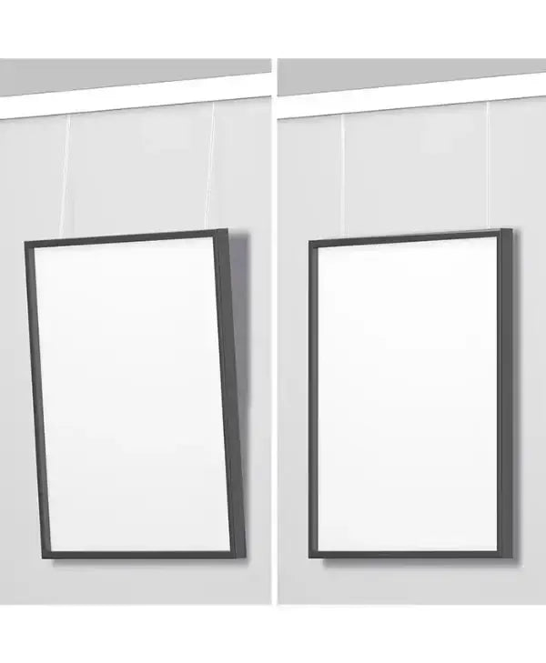 Placera Tilt Reducer högst upp på mitten av baksidan på ramen. För in Perlonlinan i fästet och nu kommer ramen tätare mot väggen. Vid bredare tavlor som hänger med två linor placeras Tilt Reducer i var sin sida på överdelen av ramens baksida.